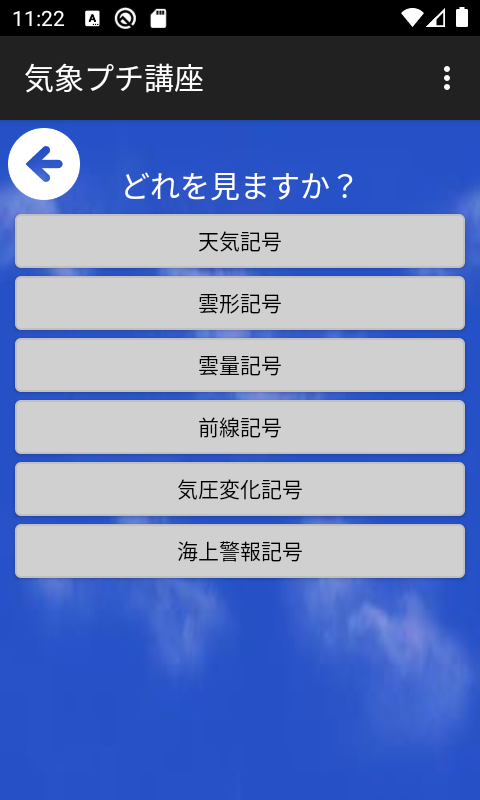 気象予報士なら誰でも知っていて当然な天気記号。でも100個もあるとなかなか覚えられません。しかも天気図には天気記号だけではなく雲量記号や雲形記号、気圧変化記号...。様々な記号を1つのアプリに収めていつでもどこでも閲覧できるようにしました。さらに効率よく覚えるならどうしたら...と考えに考えた末にクイズ機能を持たせてみました。