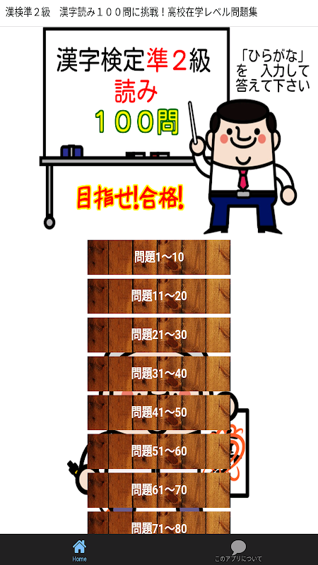 漢字検定準2級で出題される「読み問題」のみを収録した問題集です。10問×10パターン、計100問を抜粋。出題された漢字に「ひらがな」で読みを入力して答えて下さい