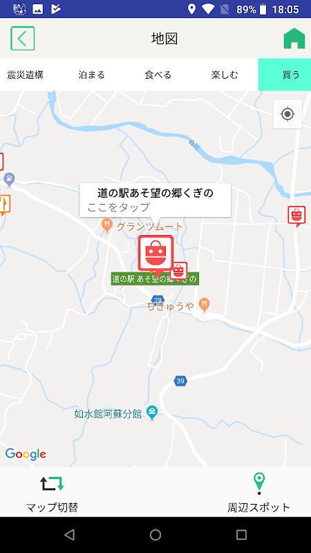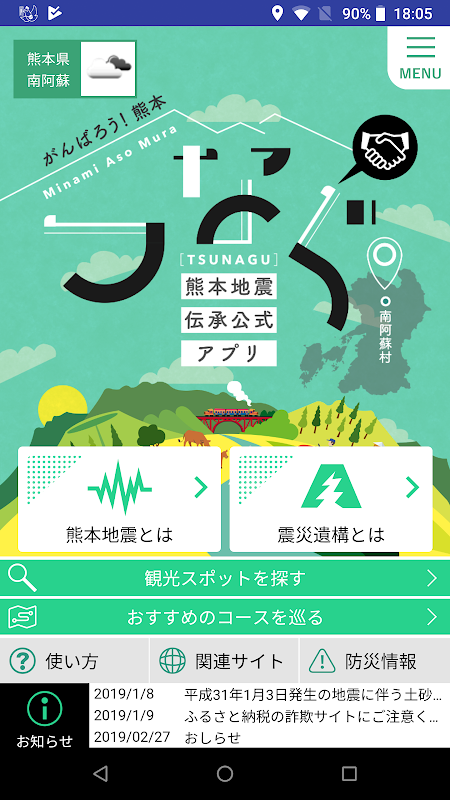 このアプリは南阿蘇村の震災による被害や復旧復興に向かう姿を知ってもらいたいという思いで製作しました。震災遺構をはじめ、観光情報なども豊富に掲載しています。