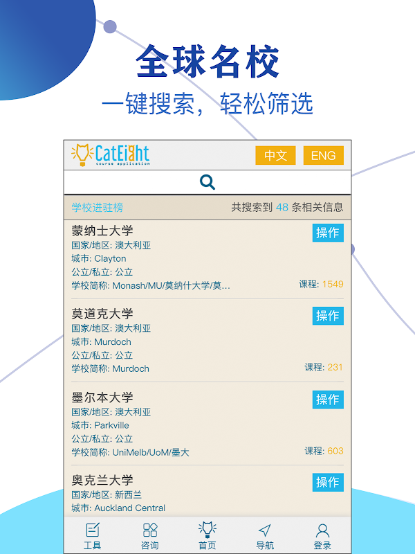 2. 新增“课程搜索”,你可以搜索澳大利亚、新西兰、新加坡的各级各类学校课程,查看课程详情;