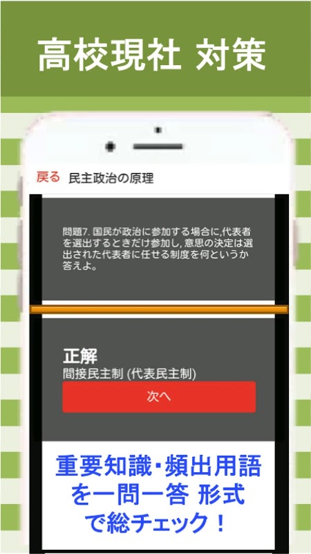高校 公民「現社」に関する大量の知識をアプリで克服!授業の復習用からセンター試験まで、合格に必要な知識問題を厳選!知識の総チェック&弱点克服に最適です!