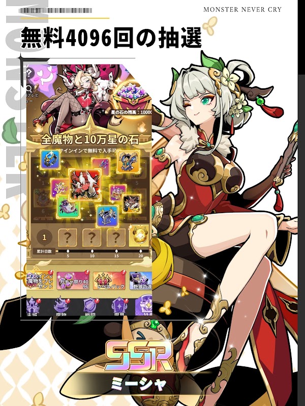 Hingga 4096 gacha hanya dengan login setiap hari! Selain itu, Anda dapat dengan mudah mengontrol dunia lain dengan keuntungan mewah seperti semua karakter dan telur monster SSR yang dapat dipilih!