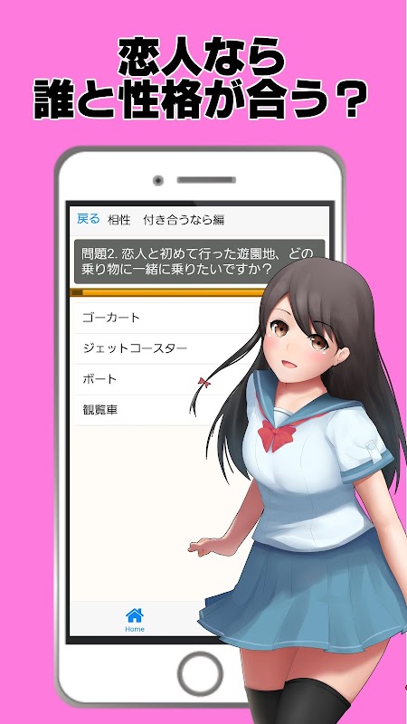 人気アイドルグループとの相性を占います。心理テスト形式で判断します。男性向けの無料ゲームアプリです。学校や通勤・通学の隙間時間にでもご遊戯ください。