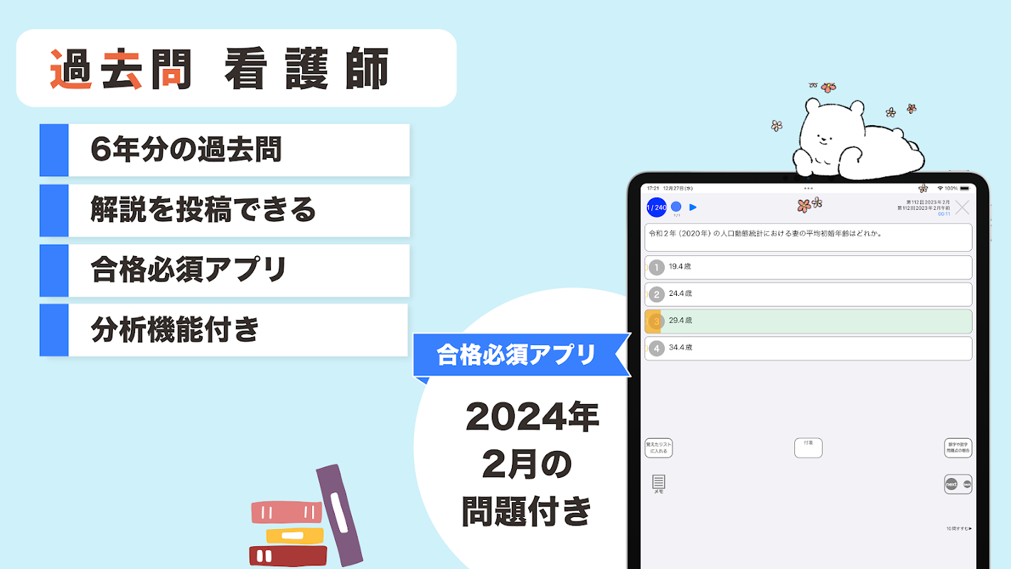Pertanyaan Perawat Februari 2024! Termasuk fungsi tes tiruan! Aplikasi yang harus dimiliki untuk lulus ujian keperawatan nasional. Anda dapat belajar menjadi perawat kapan saja, di mana saja. Sebuah aplikasi gratis untuk perawat yang memposting penjelasan.