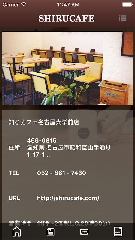 知るカフェの公式アプリです。このアプリでは、アプリユーザー限定のサービスを受けることができます。