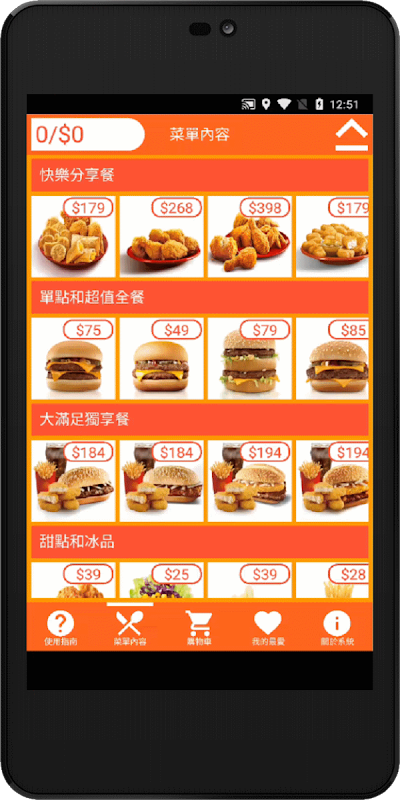 使用 ScrollBox 元件製作 速食菜單 內容,應用 REST 及 JSON 上傳 點餐資料,整合 訊息推播 功能,即時將 虛擬取餐單號 推播至用戶手機端。