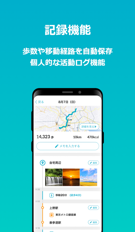 Secara otomatis mencatat dan memvisualisasikan jumlah langkah yang Anda ambil per hari, rute yang Anda ambil, dan tempat tinggal Anda. Anda dapat menautkan foto ke rute Anda, meninggalkan catatan, dan menggunakannya seperti buku harian.