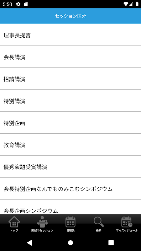 会期中、その時刻に発表されているセッションが一覧表示します。