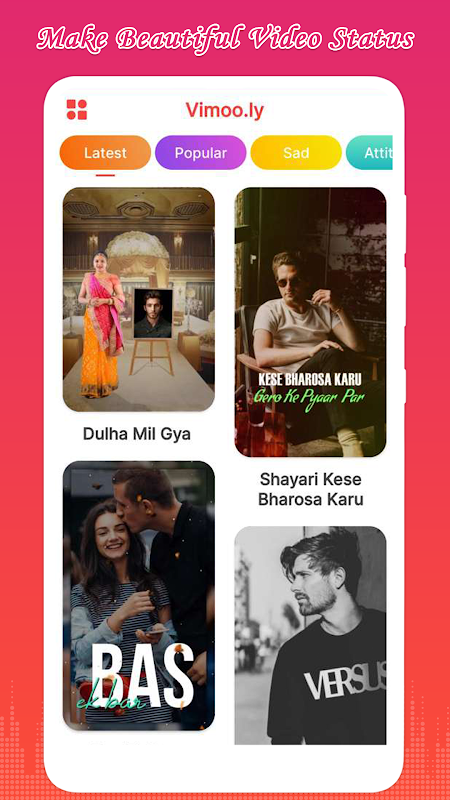 ● Tersedia kategori pembuat status video layar penuh Terbaru, Populer, Cinta, Sedih, Sikap, dan Ulang Tahun.