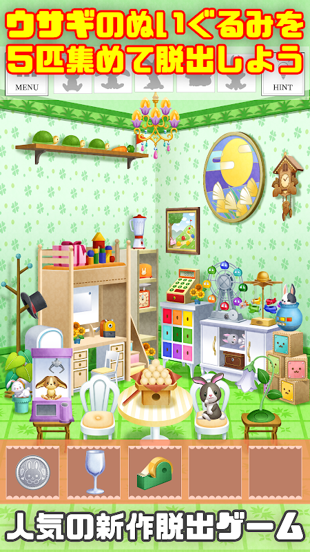 ・各ステージ毎にウサギのぬいぐるみを5匹集めると「鍵」と「脱出扉」が出現しクリアになるよ。