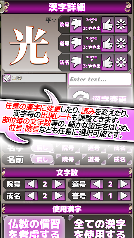 -Karena dibuat secara otomatis dengan mempertimbangkan adat istiadat Buddha, kanji yang tidak disukai secara otomatis dikecualikan. * Tidak selalu harus mengikuti kebiasaan Buddha.