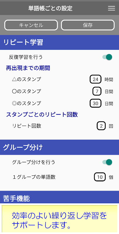Kata-kata yang dihafal tidak akan ditampilkan dan akan dikembalikan setelah jangka waktu tertentu. Jika Anda masih mengingatnya, ini adalah sistem yang membangun ingatan Anda dengan mengulangi ulasan setelah jangka waktu yang lebih lama.