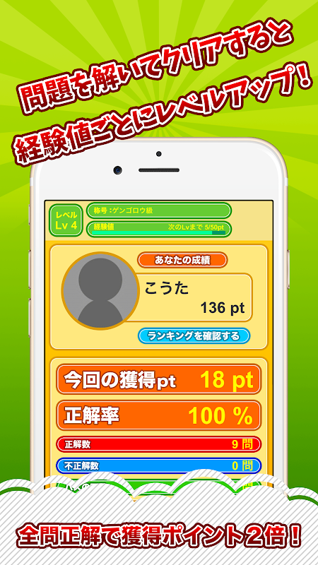 問題を解いてクリアすると経験値ごとにレベルアップ!