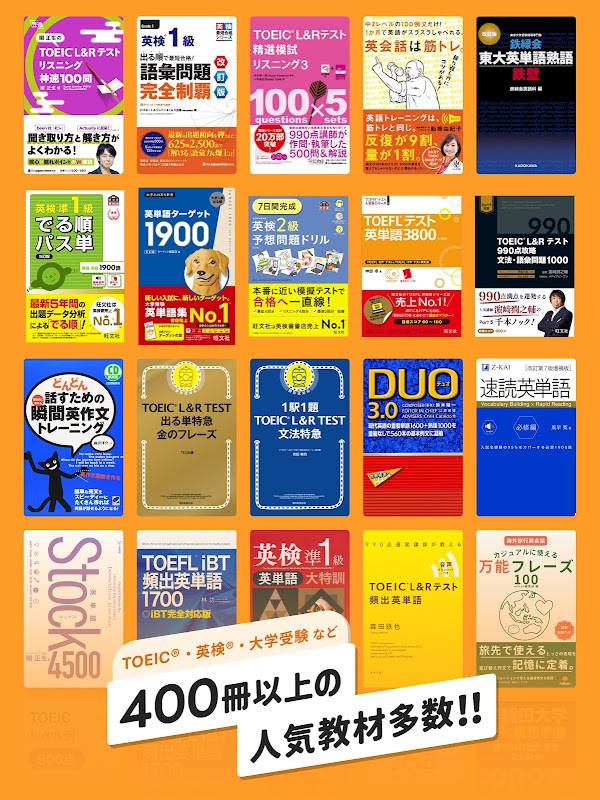 Anda juga dapat mempelajari kosakata gratis, dan mendengarkan pelafalan untuk membantu Anda menghafal! Terlebih lagi, jika Anda berlangganan paket berbayar, Anda juga dapat mempelajari soal-soal latihan tata bahasa, membaca, dan mendengarkan bahasa Inggris tanpa batas dari TOEIC, Eiken, dan ujian lainnya!