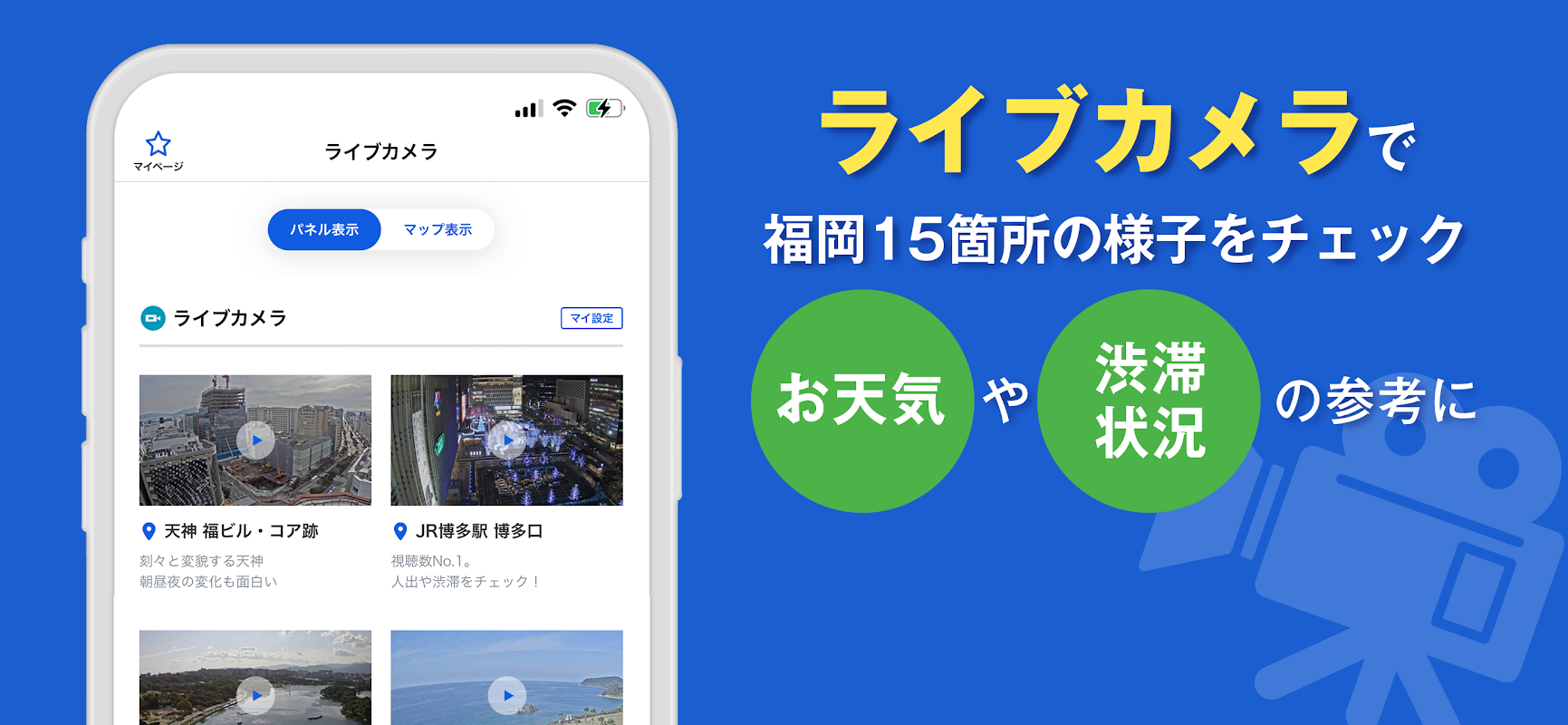Kami menyajikan kepada Anda keadaan Fukuoka saat ini, termasuk Tenjin, Nakasu, Stasiun Hakata, Stasiun Kokura, Hakata Bayside, Bandara Fukuoka, Taman Ohori, Momochihama, Itoshima Futamigaura, dan Imajuku. Kamera langsung Fukuoka tidak hanya berguna untuk mengecek cuaca dan saat terjadi angin topan, tetapi juga untuk menenangkan masyarakat Fukuoka. Kami akan menambahkan lebih banyak tempat mulai sekarang.