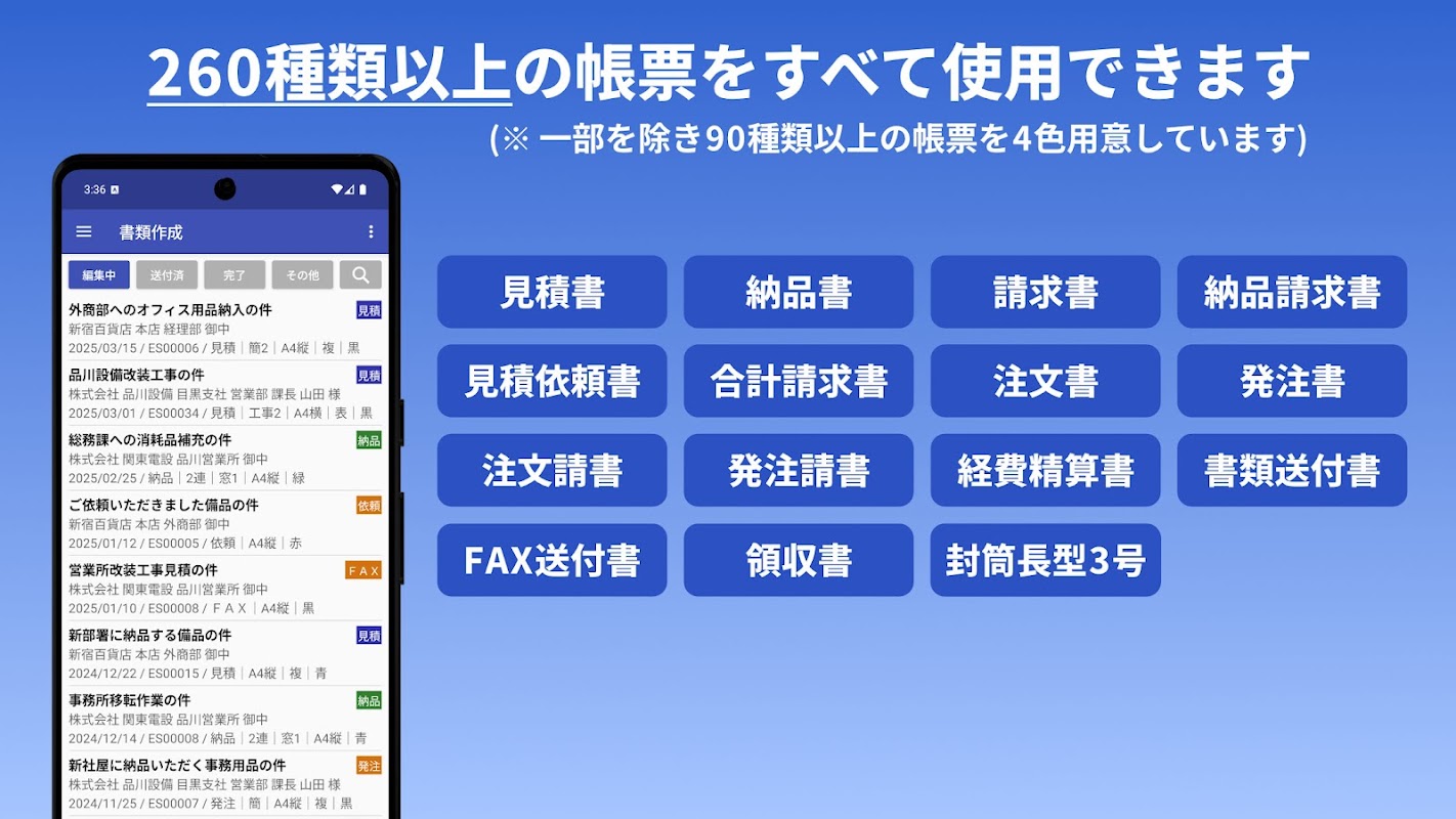 Ini adalah aplikasi pembuatan dokumen yang bahkan memungkinkan orang-orang sibuk untuk memanfaatkan waktu luang mereka secara efektif dengan ``pembuatan mudah'' dan ``keluaran rapi'' dokumen seperti tidak hanya perkiraan, catatan pengiriman, dan faktur, tetapi juga pesanan pembelian, formulir pemesanan, permintaan penawaran, surat lamaran, kwitansi, dll., baik di kantor maupun di perjalanan.