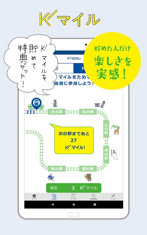 ・「Kマイル」が貯まると、抽選でアプリ限定のクーポンがゲットできます。