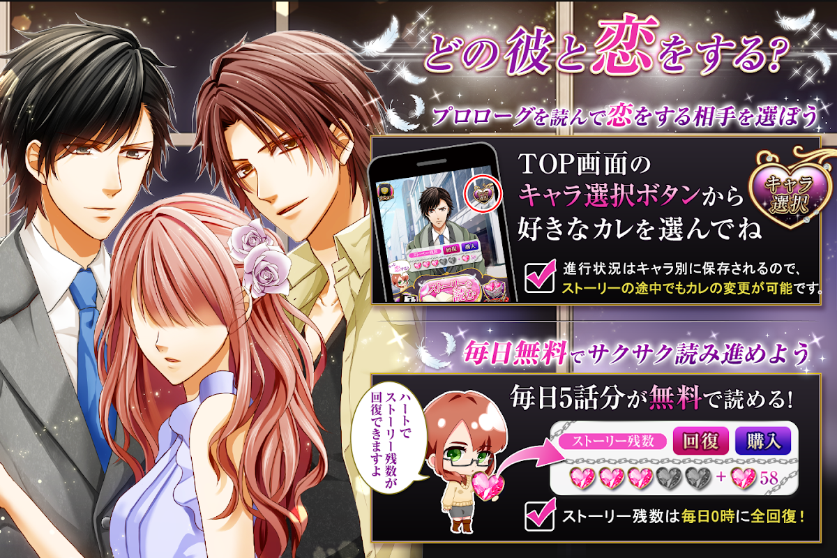 毎日5話分ストーリー無料で読める課金なし(無課金)の恋愛ゲーム 乙女ゲーム(乙ゲー)。