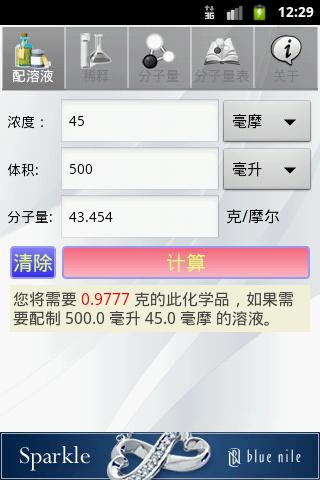 kalkulator yang nyaman untuk persiapan larutan dan pengenceran solusi platform Android berikutnya kalkulator. Ini dapat membantu atau kimia kimia siswa kelas eksperimen, dan bekerja dalam biologi, kimia, peneliti laboratorium biokimia. Kalkulator dapat membantu Anda dengan solusi cepat menghitung berat bahan kimia yang dibutuhkan atau diinginkan volume larutan induk.