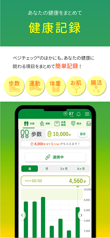 Selain VegiCheck®, Anda juga dapat mencatat hal-hal terkait kesehatan lainnya. Masukkan informasi olahraga dan kesehatan Anda dengan mudah, dan jumlah langkah Anda akan otomatis dimasukkan melalui aplikasi Kesehatan.