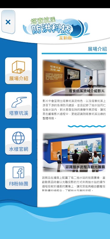 Aplikasi ini terutama merupakan aplikasi navigasi tambahan untuk Paviliun Interaktif Sains dan Teknologi Pengendalian Banjir. Sambil menonton interaksi situs pameran, Anda dapat menggunakan aplikasi ini untuk memutar konten interaktif di pameran.