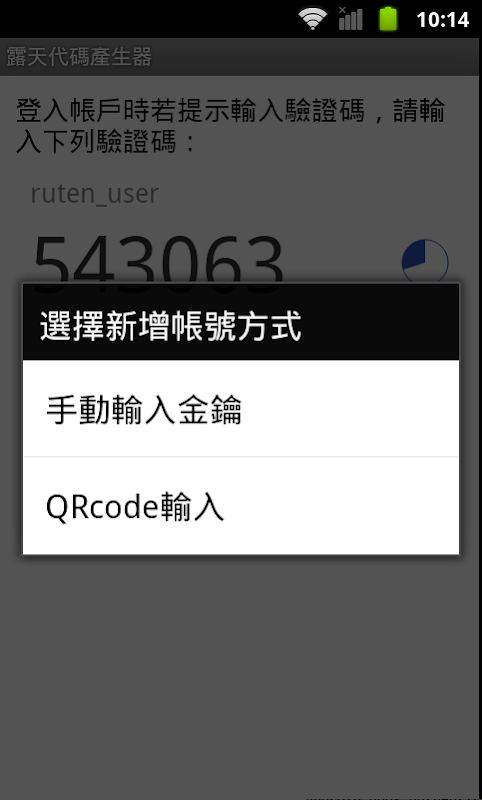4. 設定露天代碼產生器,在APP內新增帳號方式可使用QRCode輸入(須掃瞄網頁產生之QRCode)或手動輸入金鑰(在頁面中點選”無法掃瞄條碼?”會產生一組金鑰)