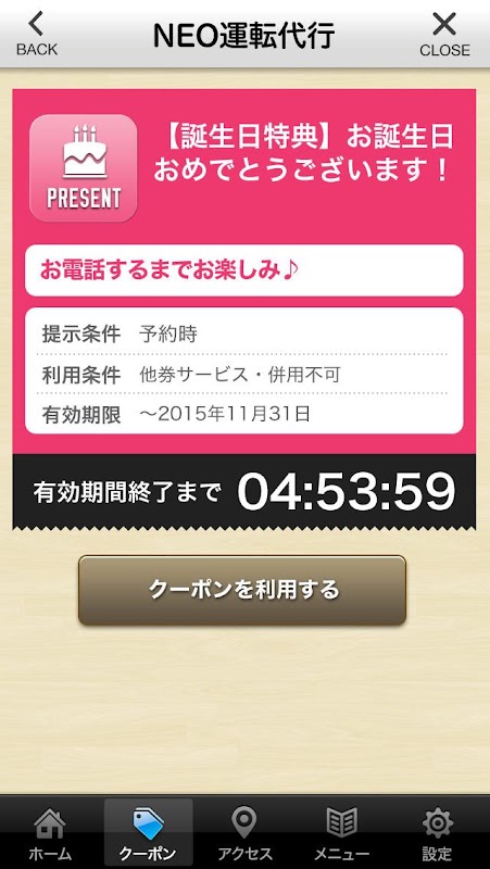 このアプリでは、NEO運転代行の色々な情報やアプリユーザー限定のお得なサービスが手に入ります!