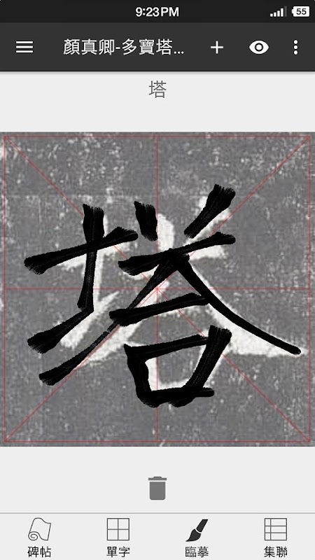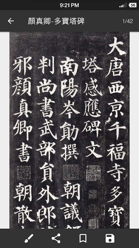 Dalam kaligrafi Dinasti Tang Yen Chen Tianbao sebelas tahun (AD 752) menulis, mencerminkan awal gaya kaligrafi, font yang rapi dan teliti, struktur standar ketat nya, pena teliti, sehingga sisi monumen ini juga generasi mendatang pemula naskah biasa template yang paling umum.
