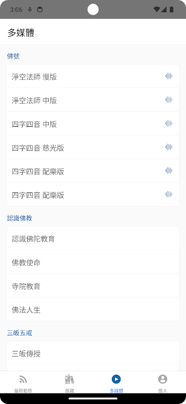 3. Multimedia - Pilih enam jenis nama Buddha dengan bebas dan gunakan ponsel Anda sebagai mesin nama Buddha; tonton kitab suci dan ajaran tentang berbagai tema dalam mode suara atau video.
