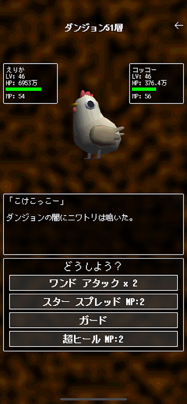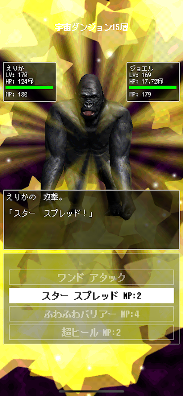Retas dan tebasan tipe JRPG retro yang menyerang musuh dengan memilih sihir (*).