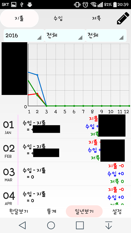 통계/일년보기 탭에서 모아진 데이터를 이용해 내 돈 사용 패턴 정보를 한 눈에 볼 수 있습니다.
