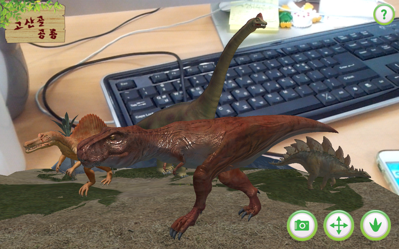 3. 고산골 공룡 AR 어플리케이션 실행 후, 프린트 한 이미지 또는 PC 화면의 이미지를 카메라 화면으로 비추면 감상하실 수 있습니다.
