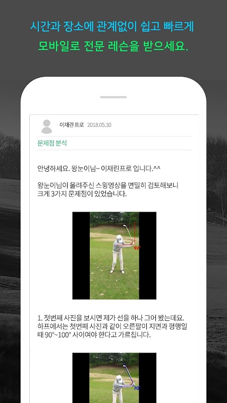 ▶ 스마트폰으로 자신의 스윙영상을 올리면 프로가 자세교정과 실력향상을 위한 TIP을 드립니다.