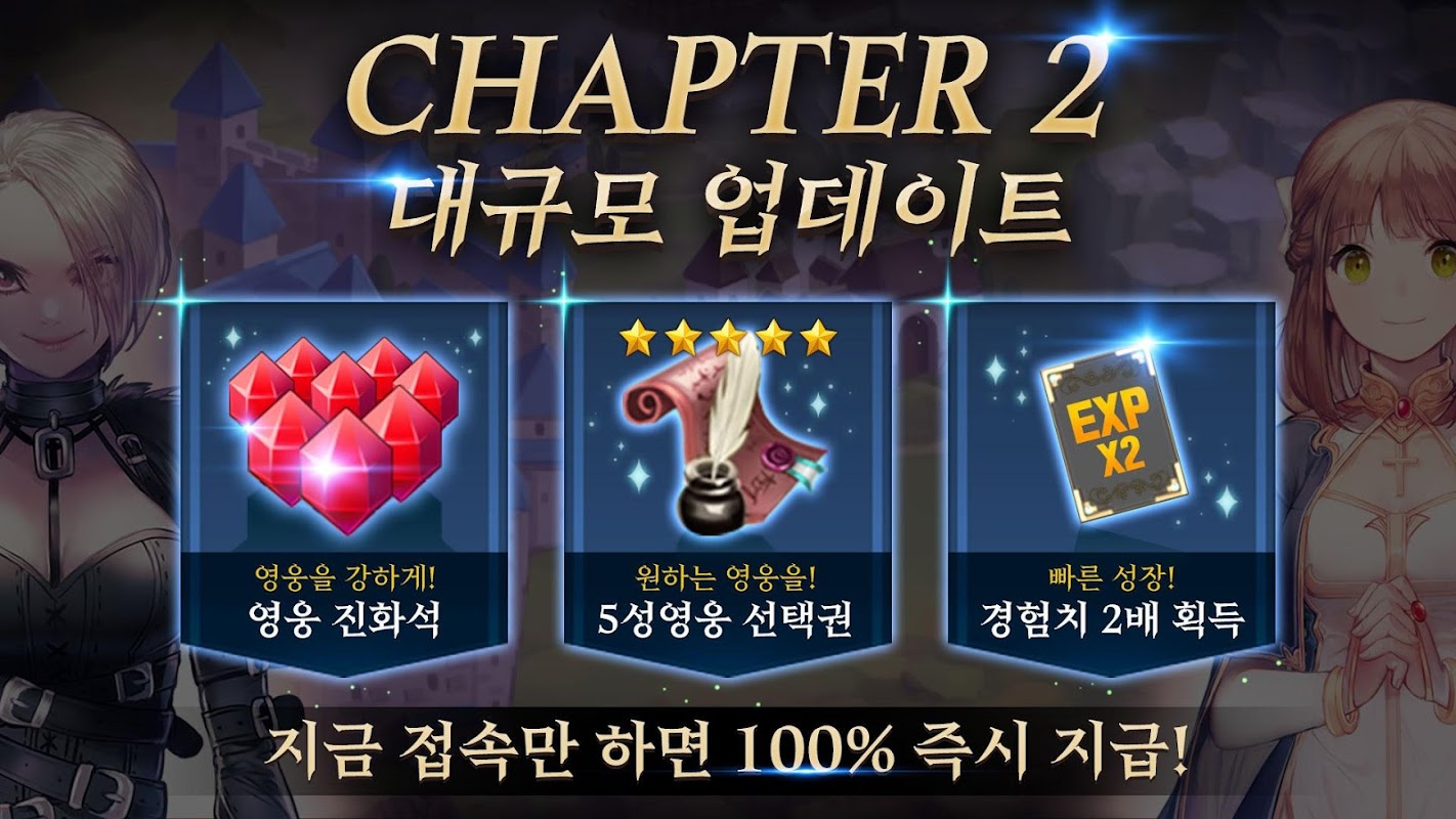 - 5성 영웅 선택권 1장 / 4성 영웅 모집권 1장 / 100,000 골드 / 다이아 1,000개