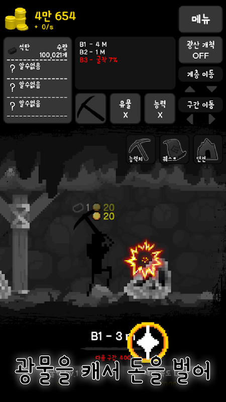 - Sentuh layar untuk meruntuhkan dinding di depan Anda dan menambang bijih untuk mendapatkan mineral dan koin!
