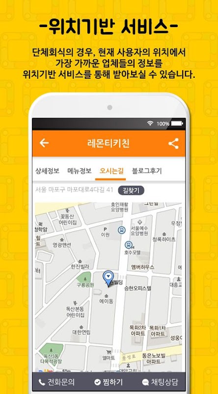 - 단체회식의 경우, 현재 사용자의 위치에서 가장 가까운 업체들의 정보를 위치기반 서비스를 통해 받아보실 수 있습니다.