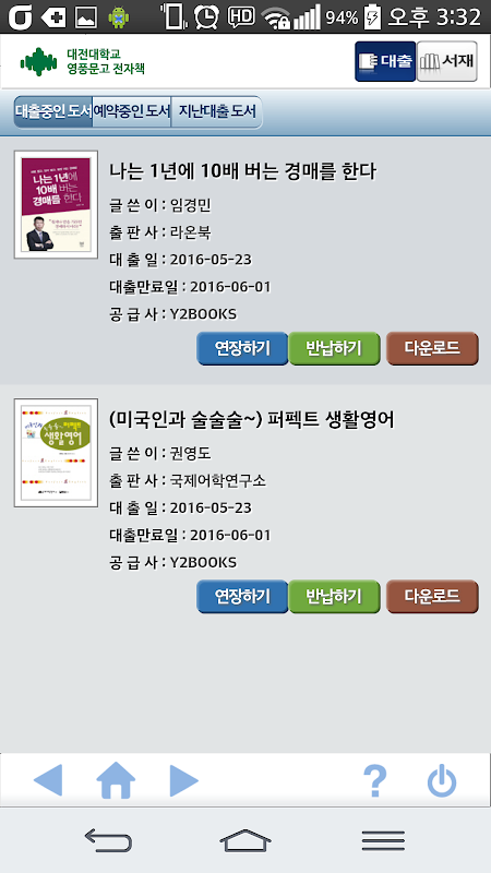 Daejeon Universitas Youngpoong buku paperback menggunakan layanan e-buku telah dikonfigurasi untuk memungkinkan penggunaan mudah pada smartphone Anda. Buku Penelusuran Buku dari Start pinjaman status, pemesanan, kapan saja, di mana saja akses melalui smartphone tanpa terhubung ke fungsi pengisian Youngpoong universitas perpustakaan e-book homepage aplikasi yang dapat digunakan, seperti di perpustakaan