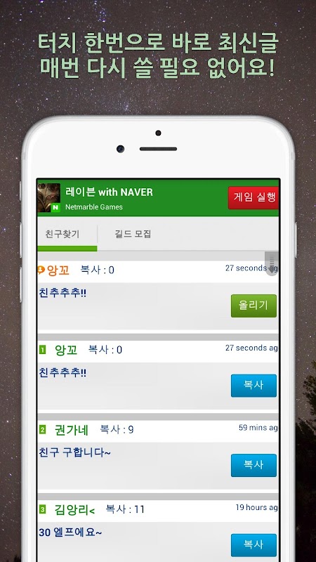 겁나 빠른 레벨업을 위한 필수앱!게임 친구, 길드,클랜 모집과 홍보를 한방에 해결해드립니다! 스팸없고~가짜없고~ 진짜 게이머를 위한 서비스!