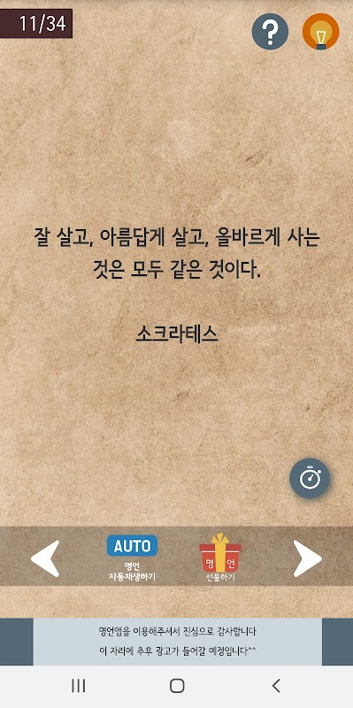 - 마음에 드는 명언을 클릭하고 클릭한 명언부터 카테고리안에 있는 전체 명언을 10초마다 자동재생해서 감상하실 수 있습니다.