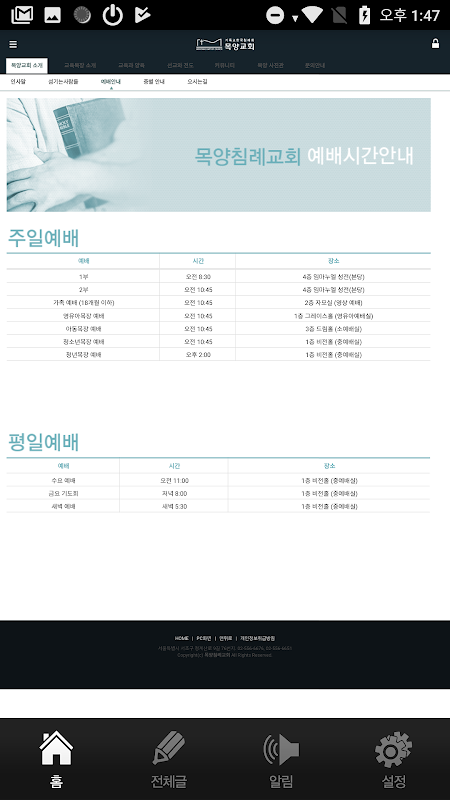 * 100% 연동형 앱 : 홈페이지에 등록된 내용, 게시물, 설교영상, 사진 등의 콘텐츠를 앱과 100% 연동하여 실시간으로 앱을 통해 확인할 수 있습니다.