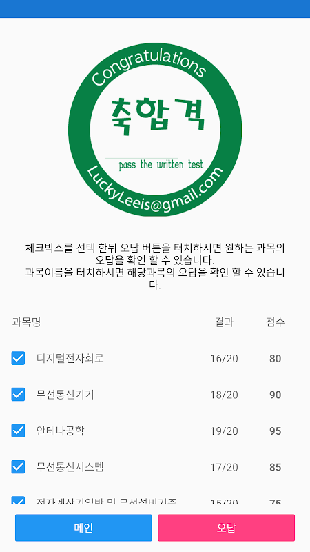 성적확인 - 각 과목별 성적 및 그동안 풀어본 기출문제와 모의고사, 문제풀기의 성적을 볼 수 있습니다.