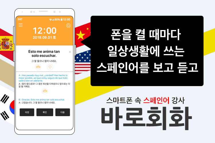 ★폰을 켤때마다 핵이득폰을 켤때마다 스페인인이 일상 생활에 쓰는 스페인어가 보입니다. 이제 '바로회화es-스페인어 회화'로 회화 정복!