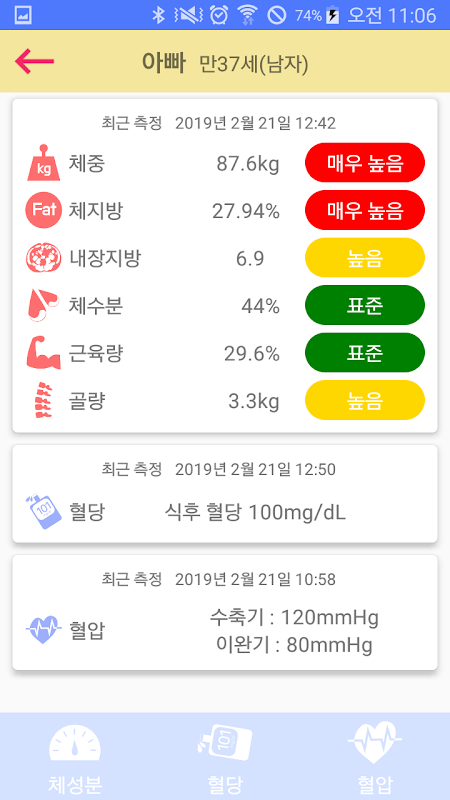 그 밖에 신체데이터 각각은 그래프를 통해 한 눈에 알 수 있고,