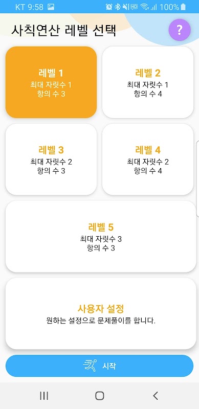 연습모드에서는 난이도별로 나뉘어진 문제를 풀거나 제한시간, 오답횟수, 문제갯수, 자릿수, 항의 수 등을 원하는대로 설정하여 문제를 풀 수 있습니다.