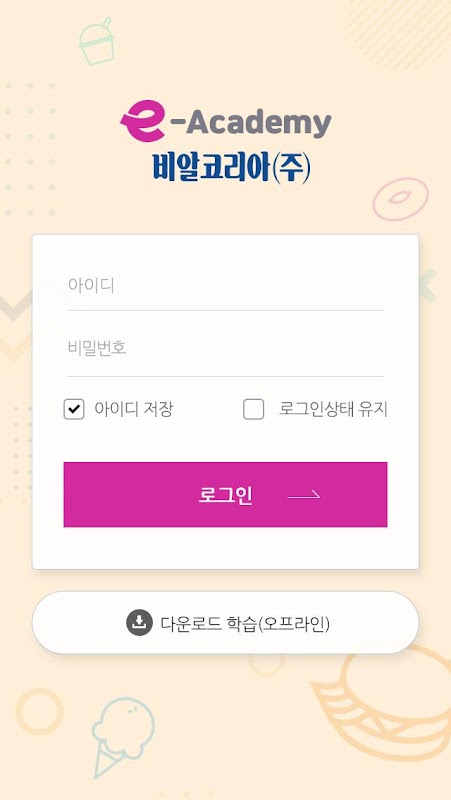 PC환경의 비알코리아(주) e-Academy (http://brk.hunet.co.kr)의 아이디와 비밀번호로 로그인 가능하며, 주요 서비스를 본 모바일 앱에서도 사용하실 수 있습니다.