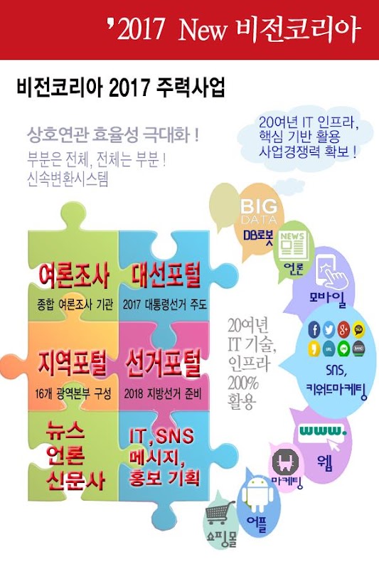 비전코리아는 지난 20여년 이상을 여론조사, 빅데이터, 뉴스, IT, 지역포털, 선거컨설팅 분야에 종사하여 전문기술을 개발, 확보해오고 있습니다.