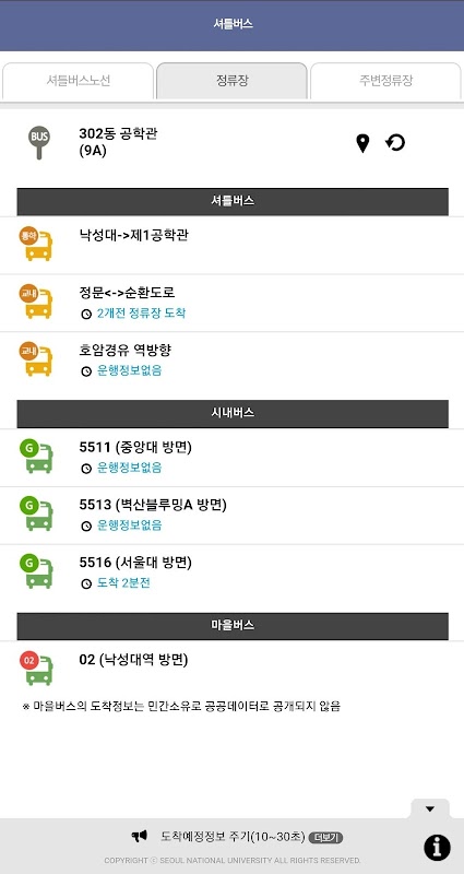 - 스마트폰 기종에 상관없이 "서울대학교 앱" 에서도 셔틀버스 위치알림 서비스를 이용하실 수 있습니다.