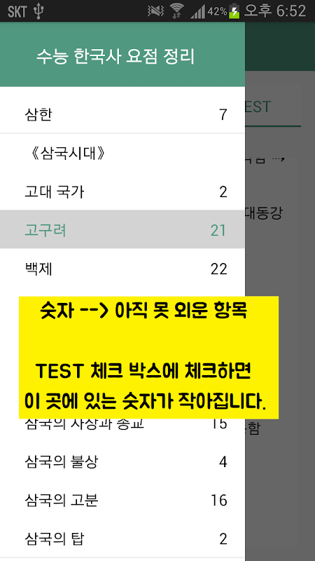 ➌ ‘TEST’ 부분은 내용을 터치하면 답이 나타납니다. 답을 확인한 후 암기했다고 생각하면 네모박스에 체크하세요. 그러면 화면에서 보이는 숫자가 바뀝니다!!