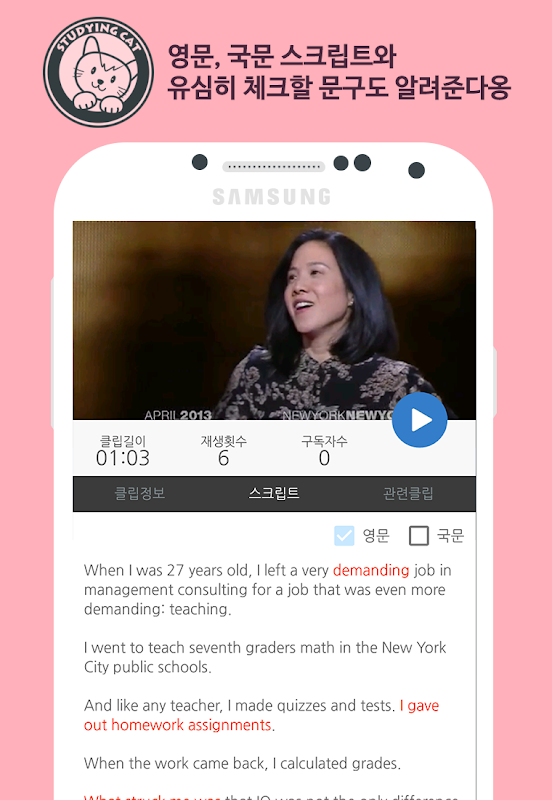고품격 스피치로 영어 공부하자냥~ 클립을 짧게 구성했으니, 출퇴근길에 열심히 공부하자냥~ 단어, 문법 등이 자연스럽게 익혀진다옹~