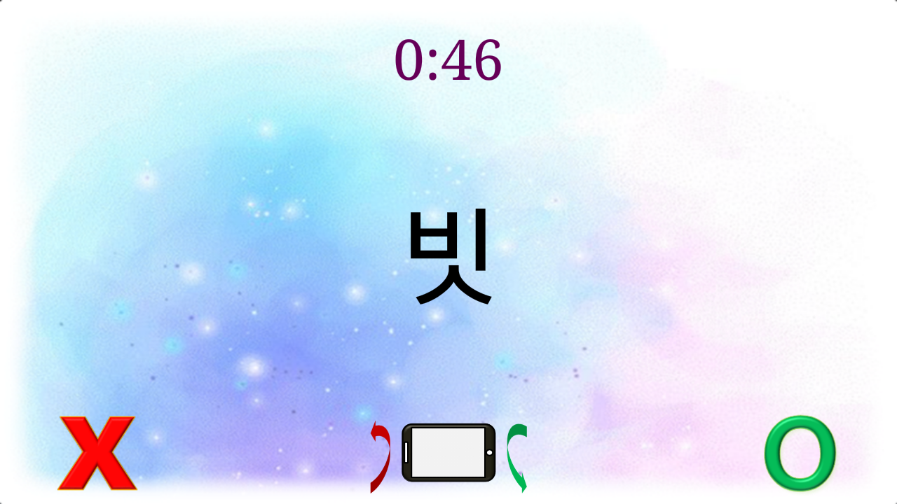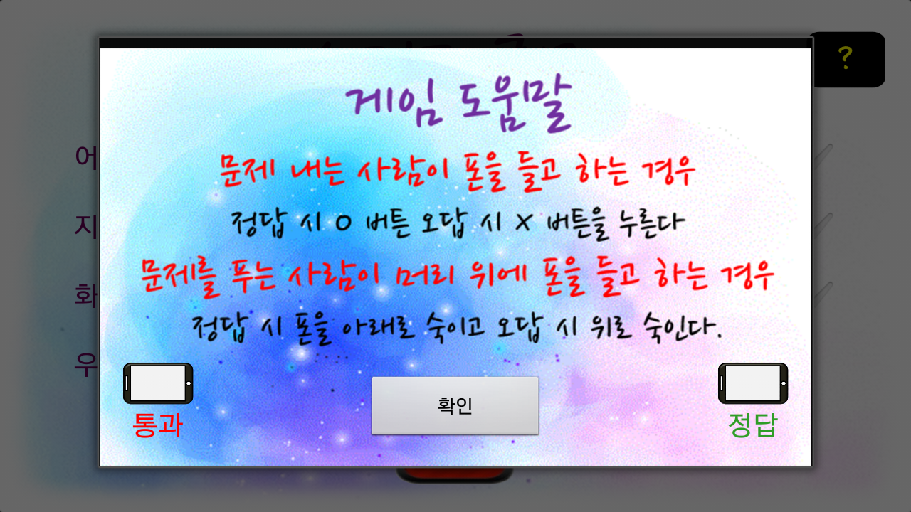2. 도전자가 핸드폰을 들고 문제를 맞추는 경우 : O인 경우에는 핸드폰을 앞으로 숙이고, X인 경우에는 뒤로 젖히세요. (핸드폰의 모션 센서를 이용하여 인식합니다.)
